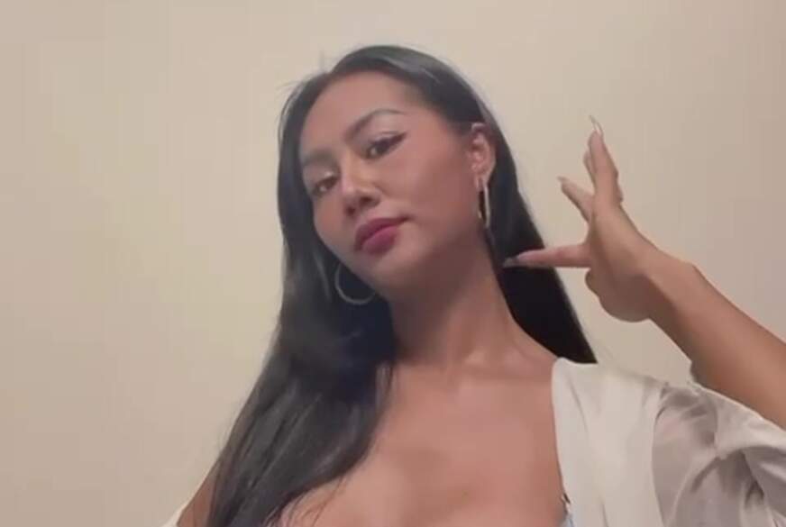 Sexy asiatische Transgenderin liegt auf dem Bett POV. Ihre großen Titten in Nahaufnahme. Sie spielt mit ihrem großen S*****z und ist geil. Ihr Sexfreund begibt sich zwischen ihre Beine und spielt mit ihrem A***h und ihrem S*****z. Sie f****n sich gegenseitig und l****n sich gegenseitig. Er kommt in ihrem großen A***h. Es ist so viel, dass es aus ihrem großen A***h herausläuft.