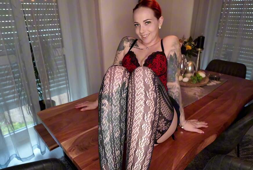 Ich warte auf DIch im Body und roten High Heels, alles geilen Körperteile liegen offen und bereit fürs f****n. Gleitgel, S****e auf das geile h**te große Ding. In Missionar steck ich ihn mir rein und er weitet meine M****i, schön rein raus, rein raus. Komm lass mal Stellung wechseln. R**z auf mein Dildo, ich dreh mich um, du kannst schön auf mein A***h glotzen und meine weite F**km****i stalken, wenn ich den DIldo reite.